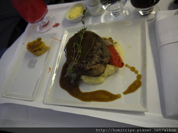 我點了牛排,其實要知道,牛排在飛機上要弄得好吃非常難的